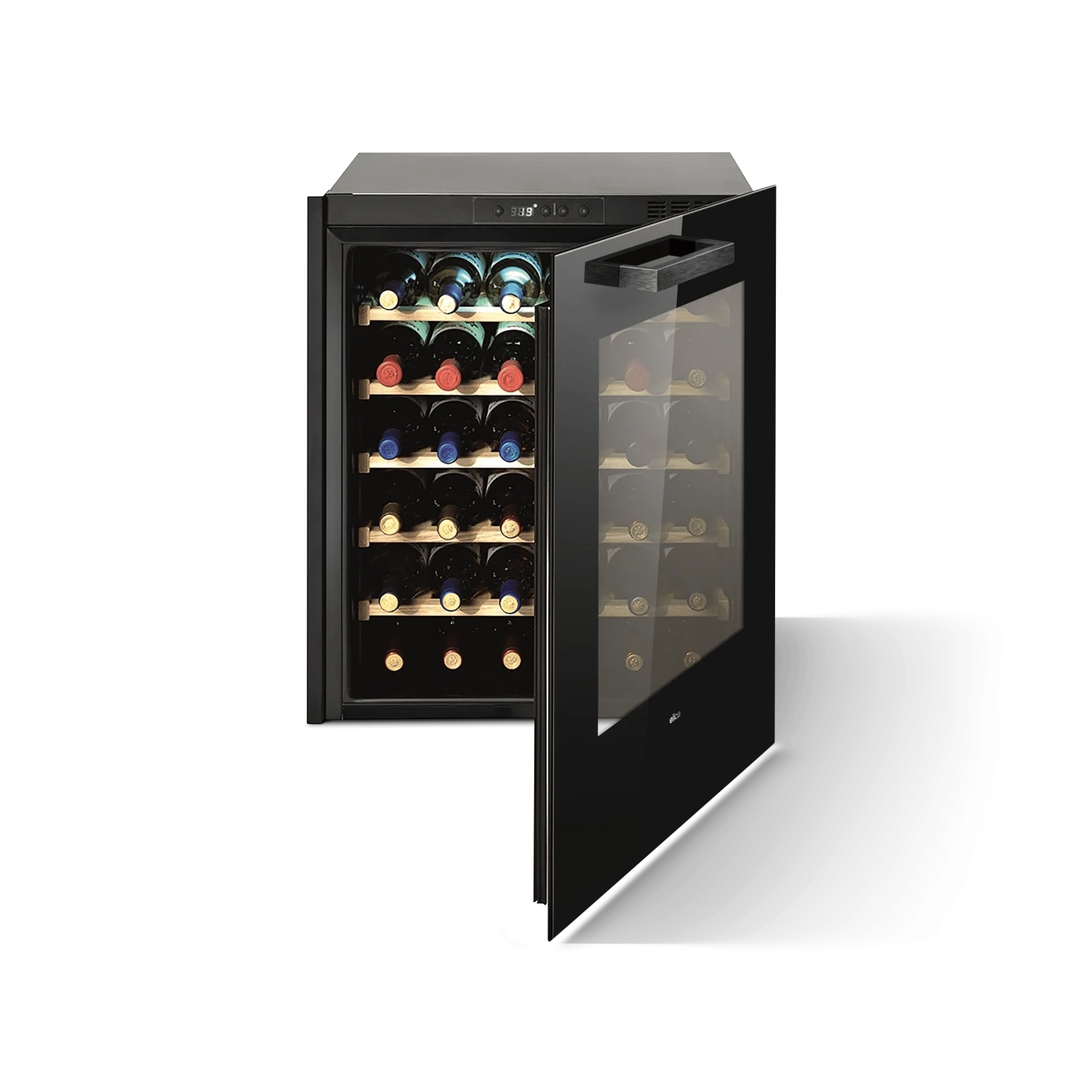 Kompakte Abmessungen und völlig schwarzes Design für ein maximales Fassungsvermögen von bis zu 24 Flaschen. Ein leistungsfähiger Kühlschrank, der für die optimale Lagerung jedes Weins konzipiert wurde