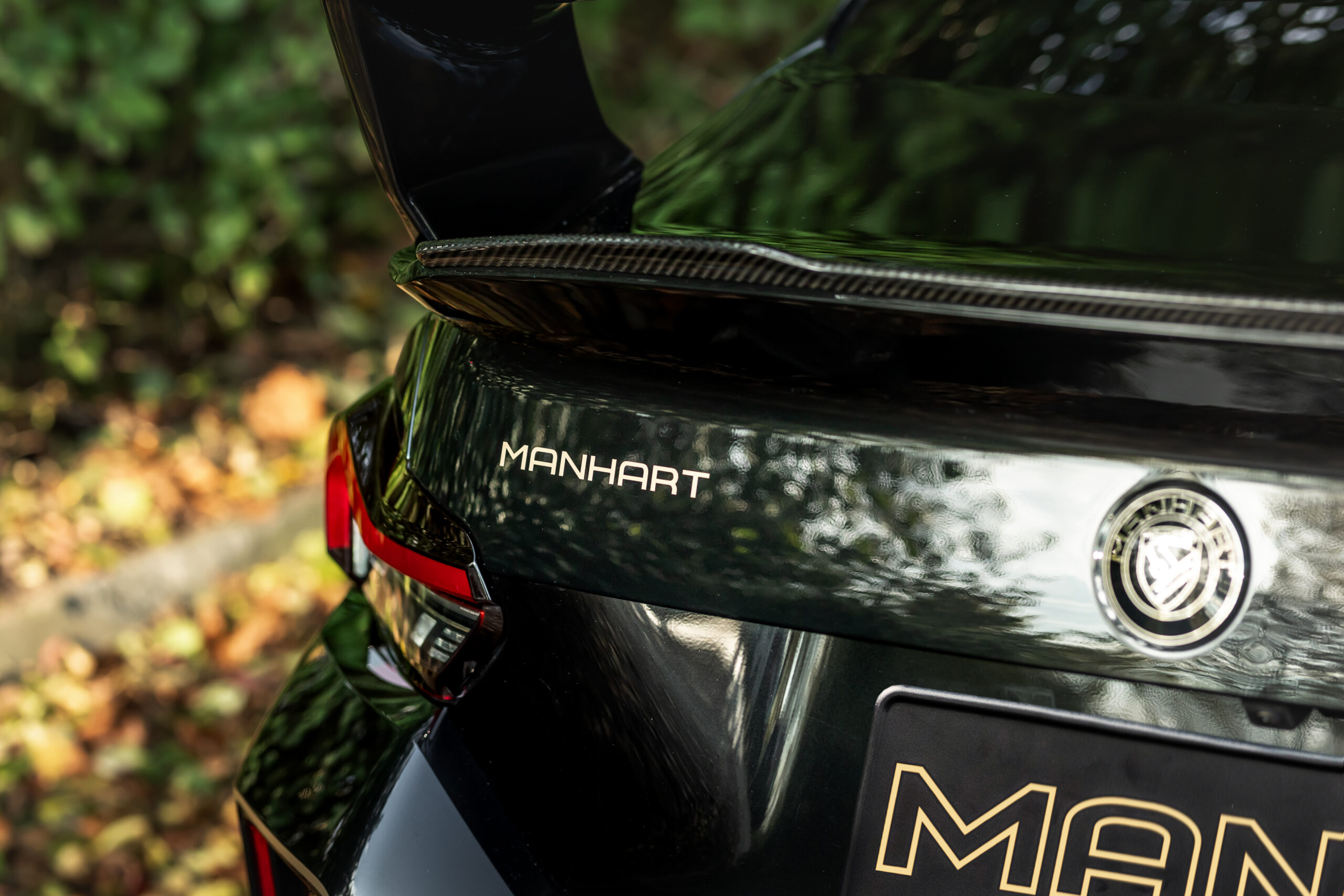 Ergänzend erhielt die Karosserie einen champagnerfarbenen MANHART-Dekorsatz. Der Innenraum zu guter Letzt ist mit einem MANHART-Überrollbügel, einem MANHART-Rückbank-Delete, MANHART-Hosenträgergurten by Schroth mit Gurtstraffern und MANHART-Fussmatten aufgerüstet.