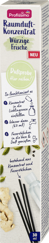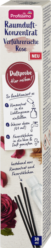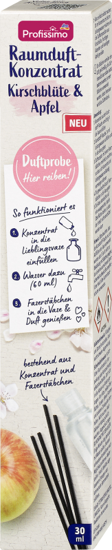 Das nachhaltige Nachfüllkonzept mit den Raumduft-Konzentraten von Profissimo bietet eine ressourcenschonende Möglichkeit, das eigene Zuhause mit einem Wohlfühlduft zu erfüllen. Alles, was dafür benötigt wird, sind die Raumduftkonzentrate mit Stäbchen, eine Vase und etwas Wasser. Ob fruchtig, würzig oder floral – Profissimo bietet das Raumduftkonzentrat in drei Duftrichtungen an, die jeden Raum mit individuellen, unwiderstehlichen Aromen bereichern: „Kirschblüte & Apfel“, „Würzige Frische“ und „Verführerische Rose“.