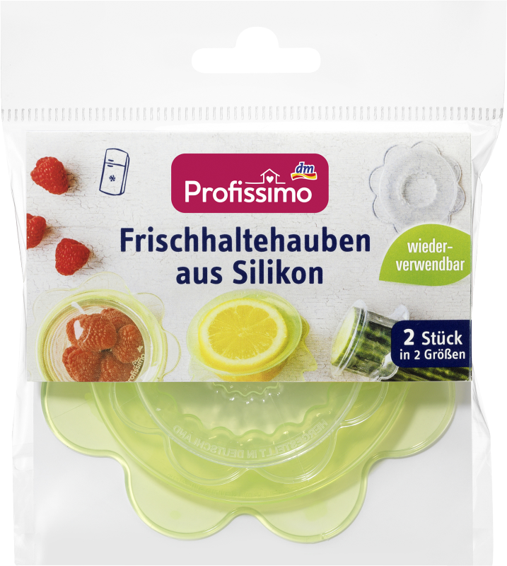 Die wiederverwendbaren Profissimo Frischhaltehauben aus Silikon im praktischen 2er-Set bieten die ideale Lösung, um angeschnittenes Obst und Gemüse sowie geöffnete Gläser, Dosen oder Schüsseln luftdicht zu verschlie ssen. Die dehnbaren Deckel passen sich flexibel an verschiedene Behälter an und gewährleisten langanhaltende Frische. In zwei praktischen Grö ssen (55 mm und 80 mm Durchmesser) erhältlich, lassen sich die Hauben nach Gebrauch mühelos in der Spülmaschine reinigen.