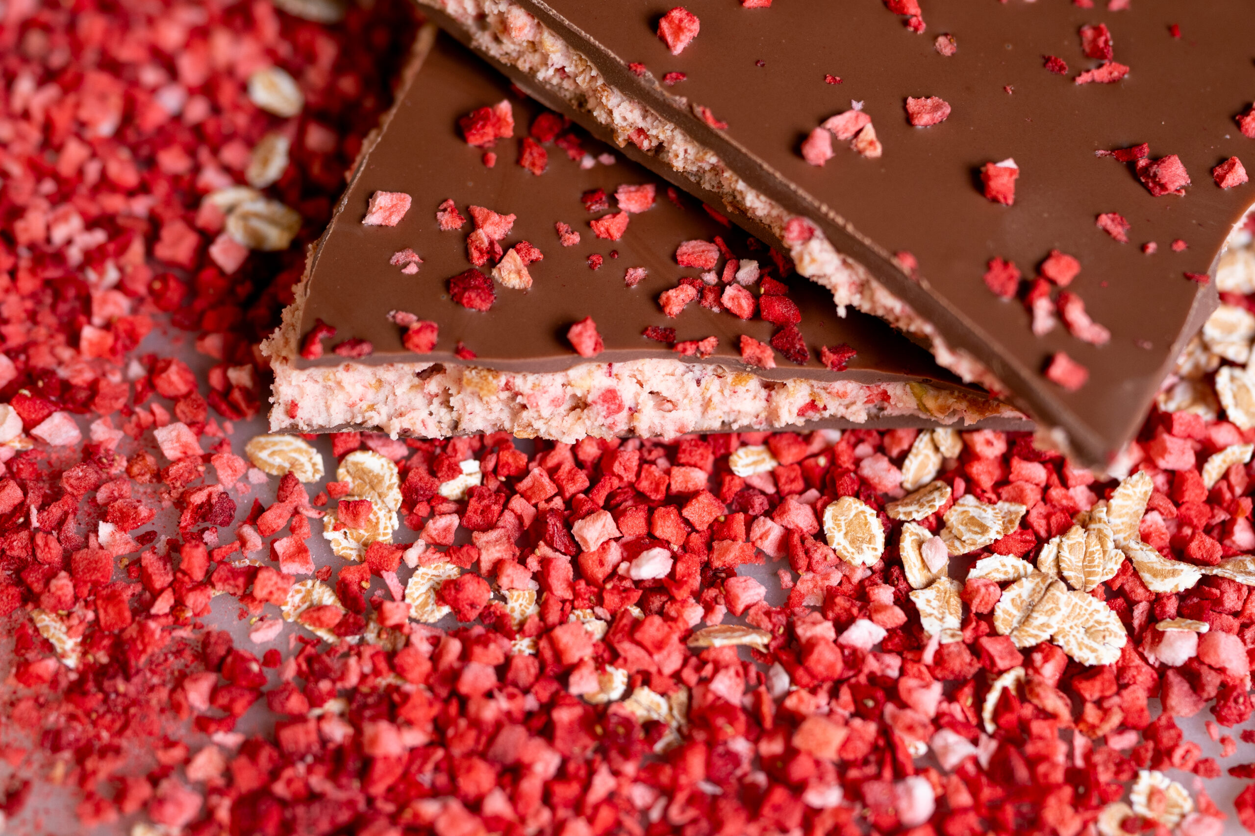 Diese neue und von zentralen Schweizer Geschmacksrichtungen inspirierte Innovation wird exakt eine Woche nach der FrischSchoggi Dubai, ab dem 21. Dezember 2024, in denselben 23 Chocolaterien lanciert. Die von Birchermüesli inspirierte, fruchtige Füllung mit cremigem und knusprigem Kern aus einer Mischung von Joghurt sowie Apfel- und Erdbeerstückchen wird in ihrer Textur ergänzt durch Rochermandeln, Brombeerpulver, gepufften Dinkel und Waffelsplitter, die mit einer reichhaltigen dunklen sowie Milchcouverture umhüllt sind.