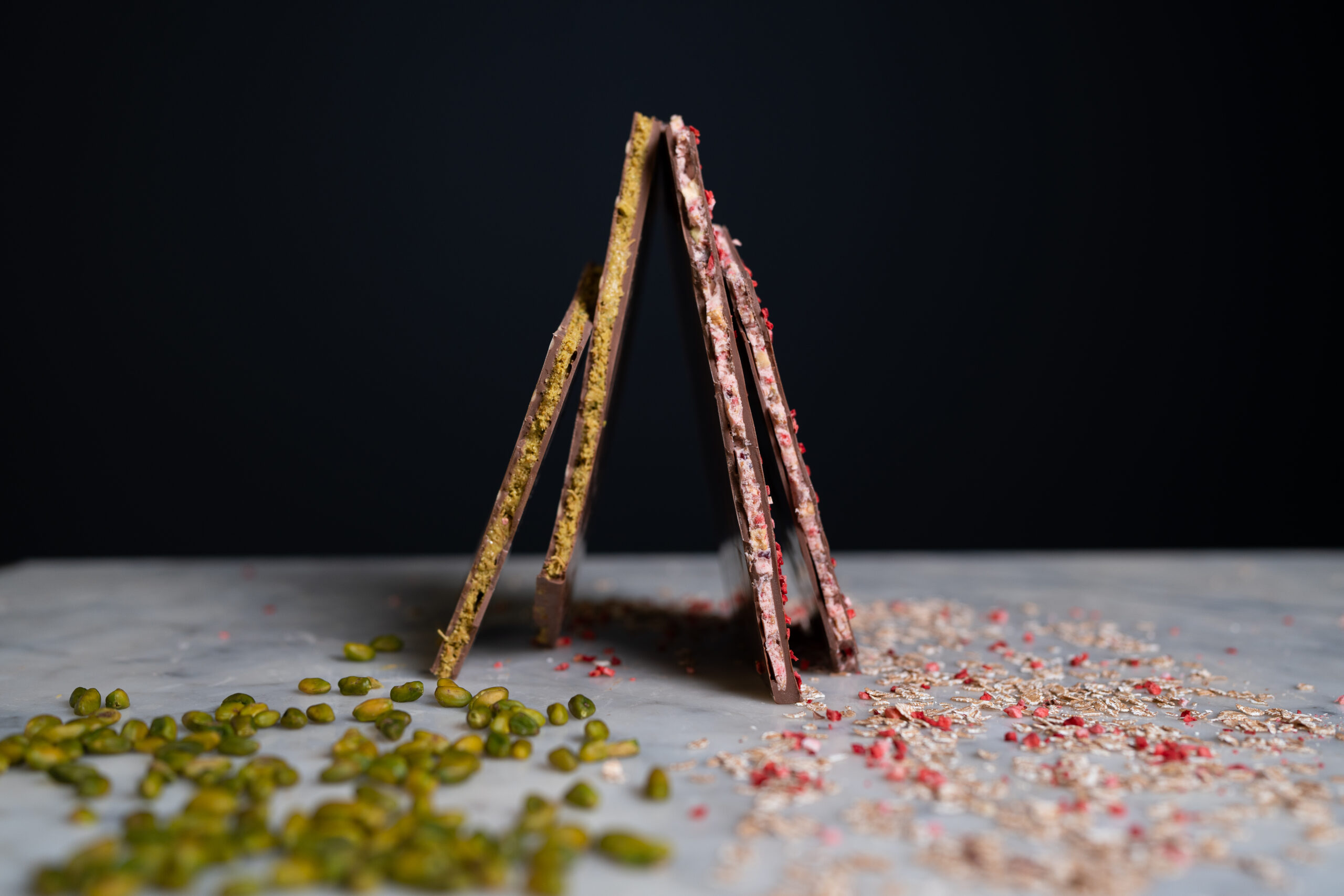 - Die leuchtenden, von Hand auf jeder FrischSchoggi Tafel dekorierten Pistazienstreifen sind eine Hommage an den Nahen Osten als ihre Inspirationsquelle.