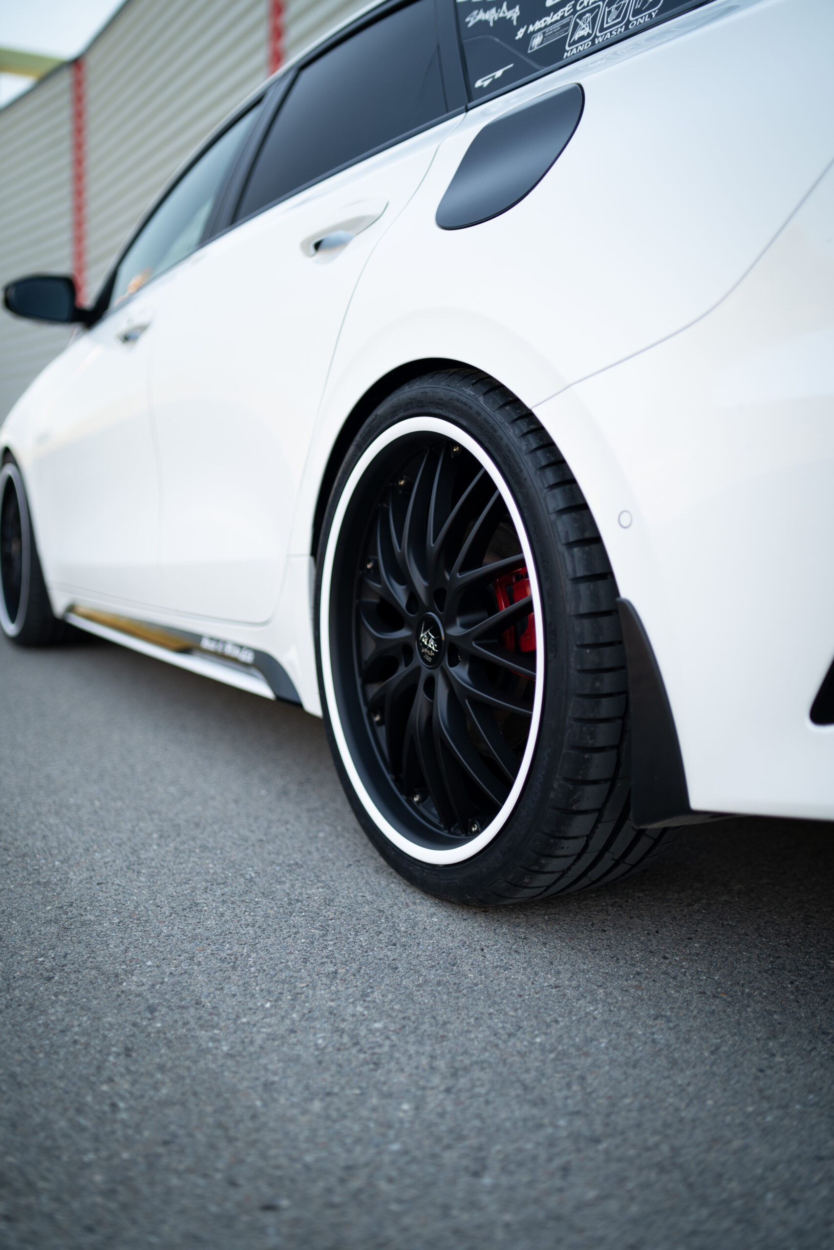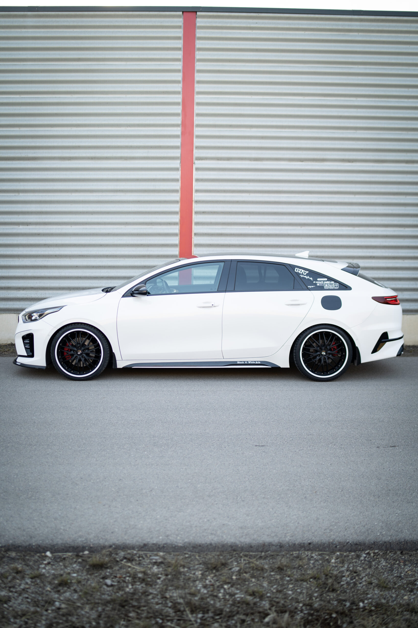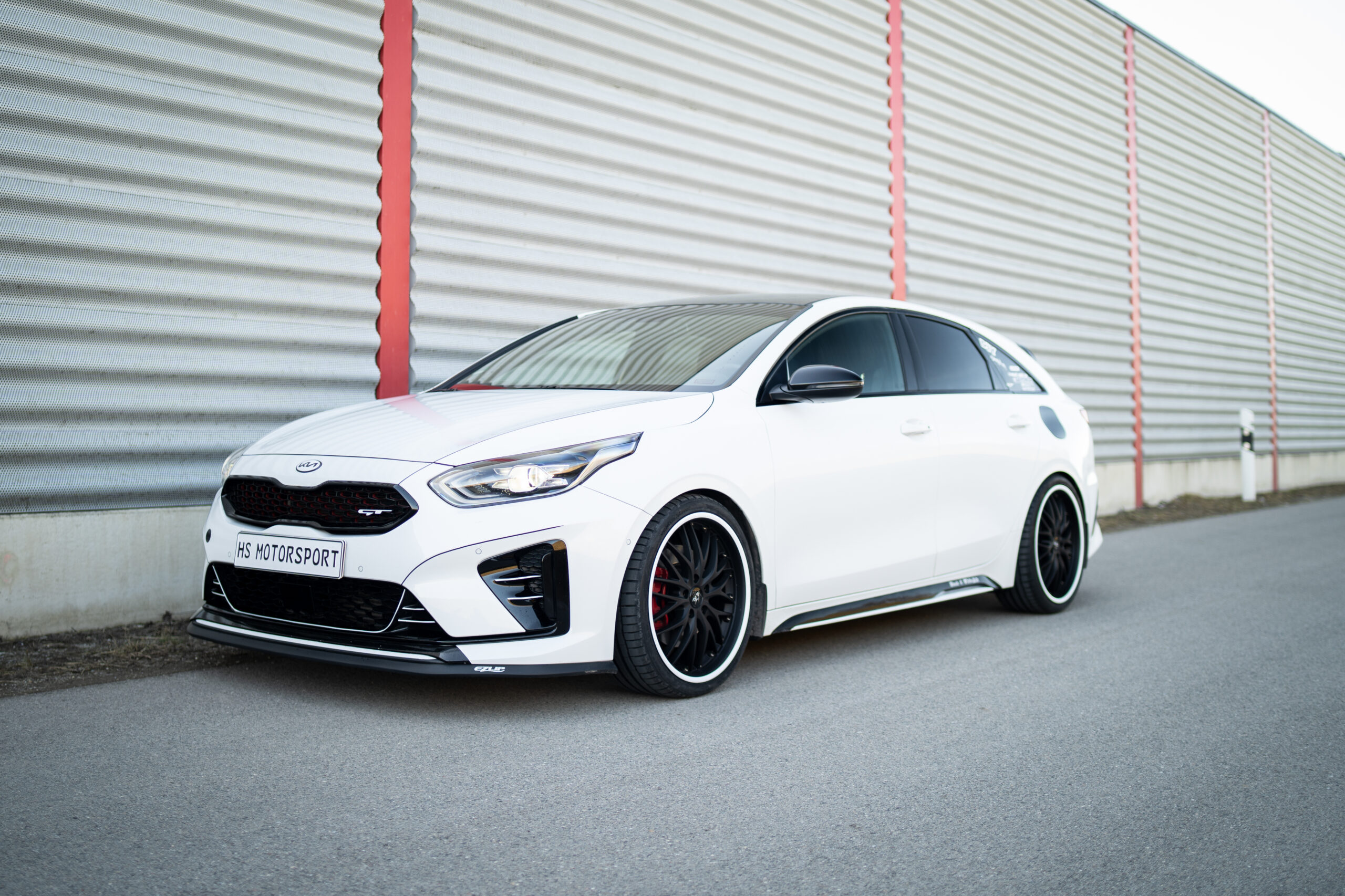 Verantwortlich für den Umbau zeichnen die Spezialisten von HS Motorsport, beheimatet im bei München gelegenen Eching. Sie installierten die Voltec T6 in der Dimension 8×19 Zoll an den Achsen des trendigen Shooting Brakes aus Korea. Die aufgezogenen Hankook-Bereifungen messen 225/35R19. Und die ergänzende Tieferlegung um vorne 40 und hinten 35 Millimeter wurde mit Hilfe eines ST XA-Gewindefahrwerks erreicht.