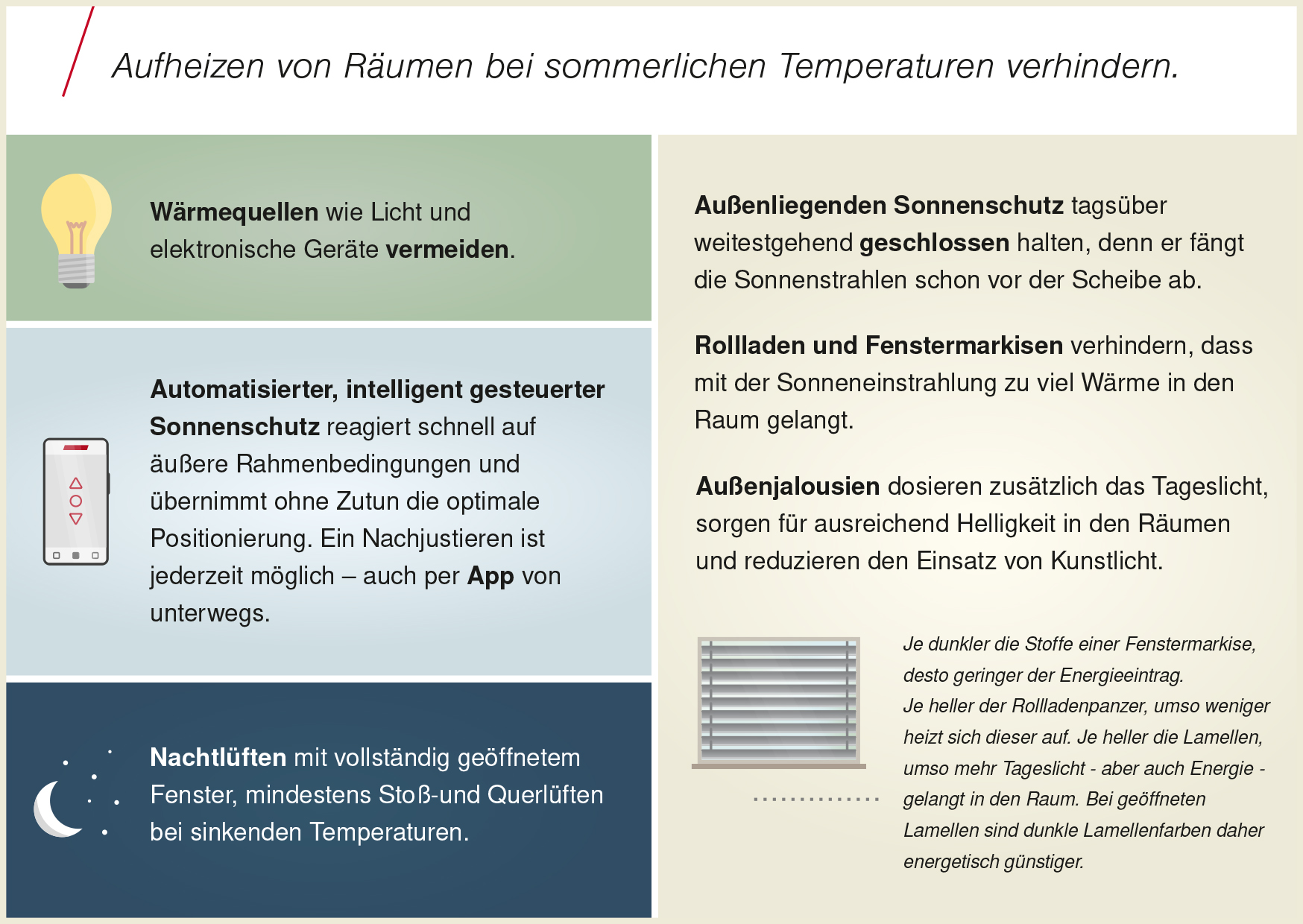 Genug Sonne getankt? Dann lässt sich das Erfrischungsgetränk im Wohn- oder Essbereich doch am besten geniessen, wenn es dort richtig schön kühl ist. Der erste Gedanke gilt hier häufig einer Klimaanlage – doch nicht nur die Anschaffung ist teuer, auch der Energieverbrauch steigt massiv an. Eine kostengünstigere und nachhaltigere Alternative sind smart gesteuerte aussenliegende Sonnenschutzprodukte wie Aussenjalousien, Rollläden oder Fenstermarkisen, die in den warmen Sommermonaten bei richtiger Anwendung die Sonnenstrahlen schon vor der Scheibe abfangen und vor Überhitzung der Räume schützen.