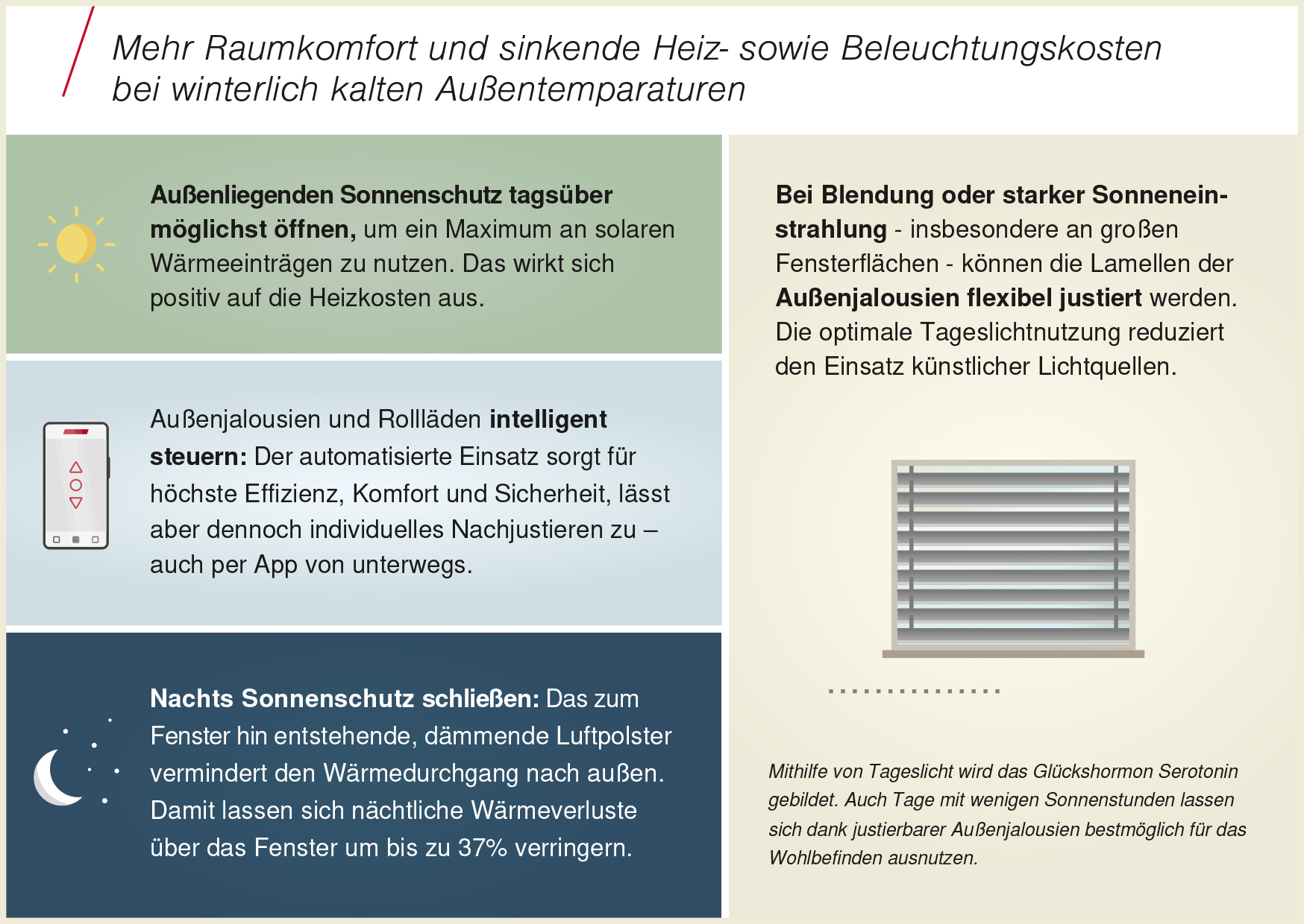 Wer sehnt sich nach einem kalten Wintertag im Freien auf einen behaglich warmen Abend am prasselnden Kaminfeuer? Doch auch die besten Heizquellen nützen wenig, wenn die Wärme durch Fenster und Türen entweicht. Hier kommen die wärmedämmenden Eigenschaften moderner Sonnenschutzprodukte ins Spiel: In der kalten Jahreszeit sorgen Luftpolster zwischen dem aussenliegenden Sonnenschutz und dem Fenster in der Nacht für eine verbesserte Wärmedämmung, sodass die Wärme im Raum bleibt – das Ergebnis ist eine Reduzierung des Heizenergiebedarfs um bis zu 37 Prozent.
