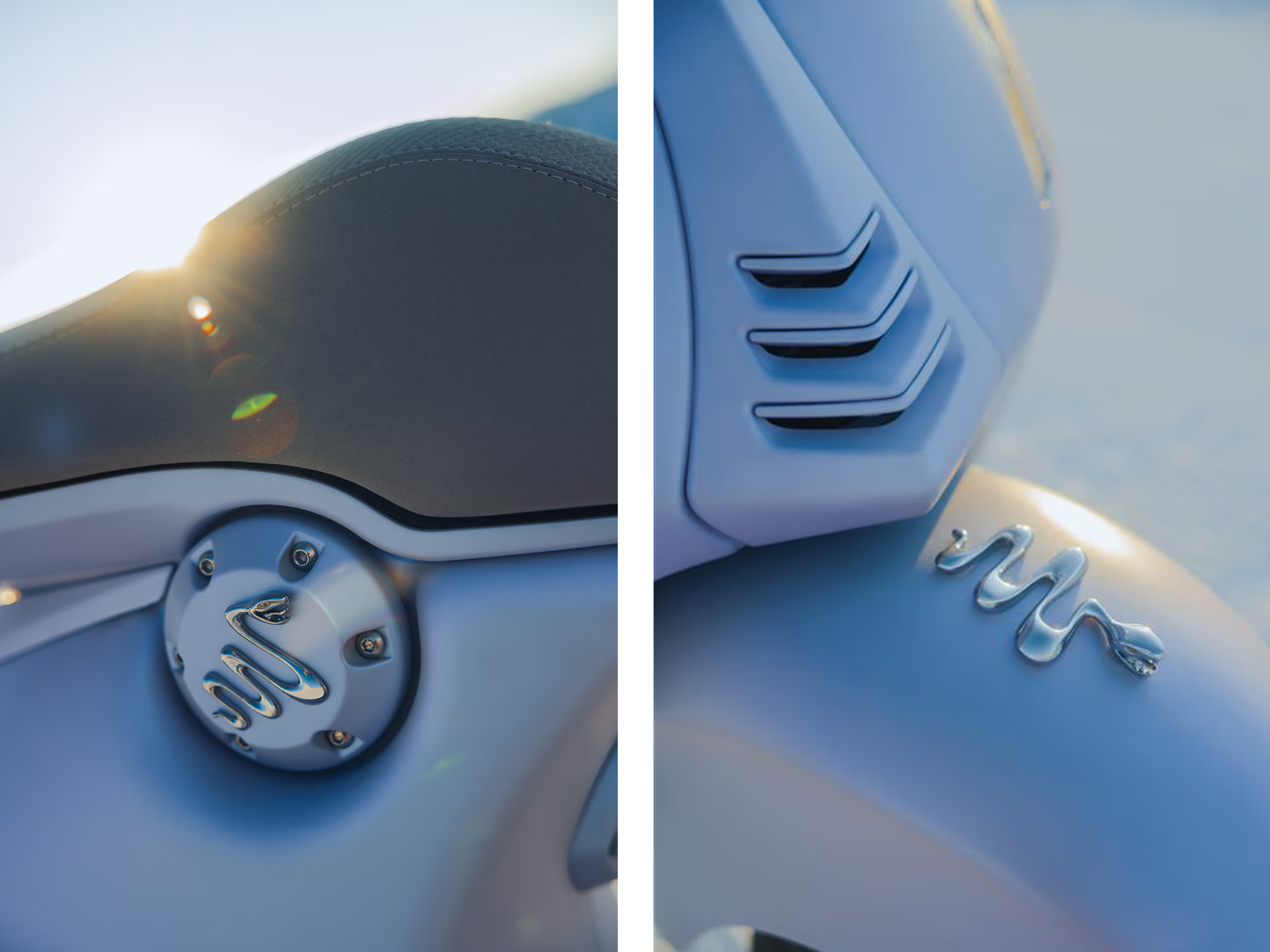 Mit einem Design, das von eisigen Landschaften und der himmlischen Schönheit des Winters inspiriert ist, besticht die Vespa 946 Snake durch ihre schillernde blaue Lackierung in eisigen Farbtönen, die der Reinheit und Stärke schneebedeckter Landschaften Tribut zollt. In diese Gletscherlandschaft ist die Inspiration der Schlange eingewoben, die durch die Lenkergriffe und den Sattel vermittelt wird, die so modelliert sind, dass sie an die weiche Textur der Tierhaut erinnern. Die verchromte Schlange, die sowohl auf dem Tankdeckel als auch auf dem Kotflügel zu sehen ist, vervollständigt ein Designprojekt, das Stärke, Anmut und Originalität miteinander vereint.