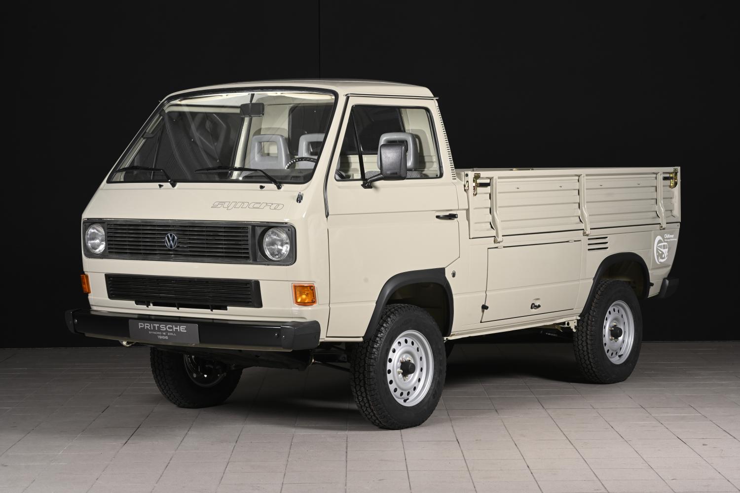 T3 mit 16-Zoll-Rädern als Pritschenwagen: Für extremste Geländeeinsätze gab es den T3 syncro ab 1987 sogar mit 16 Zoll grossen Rädern und umfangreichen Modifizierungen am Fahrwerk und an der Karosserie, grösser dimensionierten Bremsen und einer serienmässigen Hinterachssperre. Die Verstärkungen erhöhten die Nutzlast im Gelände auf eine Tonne. Die Bodenfreiheit wuchs auf 246 Millimeter (+ 25 mm). 2138 dieser Heavy-Duty-Allradler – von insgesamt 45’478 gebauten T3 syncro – verliessen bis 1992 die Grazer Hallen und begleiteten Expeditionen, Weltreisende, Forst- und Handwerksbetriebe. Nur rund 60 dieser Volkswagen auf dem Level von Expeditionsfahrzeugen wurden als Pritsche mit Ladefläche aufgebaut, betrug doch der Mehrpreis für den syncro-Antrieb und den 16-Zoll-Umbau rund 50 Prozent gegenüber der heckgetriebenen Pritschenvariante. Heute einen solch frühen Allrad-Pickup als Oldtimer zu finden, ist kaum mehr möglich.