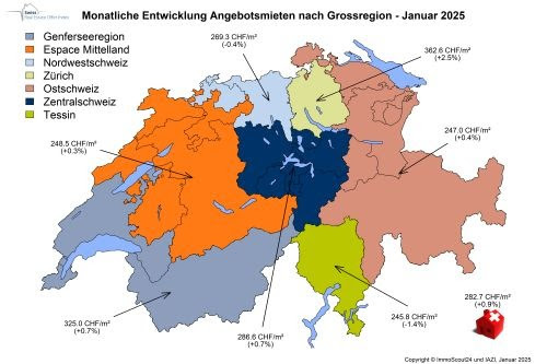 Mietwohnungen wurden im Januar im Landesdurchschnitt zu 0,9 Prozent höheren Preisen ausgeschrieben als noch im Dezember. Deutlich teurere Angebote waren dabei besonders in der Grossregion Zürich zu beobachten (+2,5 Prozent), ebenfalls steigende Marktmieten verzeichneten die Genferseeregion (+0,7 Prozent), die Zentralschweiz (+0,7 Prozent), die Ostschweiz (+0,4 Prozent) und das Mittelland (+0,3 Prozent). Dagegen gibt es aber mit der Nordwestschweiz (-0,4 Prozent) und dem Tessin (-1,4 Prozent) auch Regionen, die mit rückläufigen Mietpreisen aufwarten.