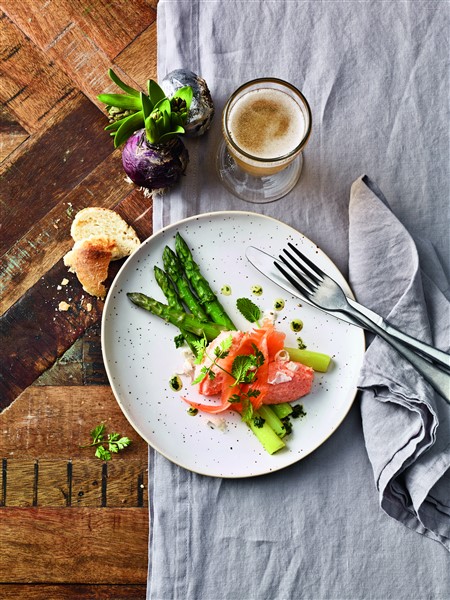 Welch wunderbare Frühlingssymphonie: Zart marinierter knackiger Spargel trifft auf die feine, rauchige Note einer luftigen Rauchlachsmousse. Oder Garten trifft auf Meer: Eine Balance aus Frische mit Kerbel, Zitronenmelisse und Zitronensaft mit der Raffinesse von subtilem Räuchergeschmack. Wer die Mousse mit einer etwas gröberen Konsistenz mag, kann dank dem PULL CHOP Universalhacker auf einen Stabmixer verzichten.