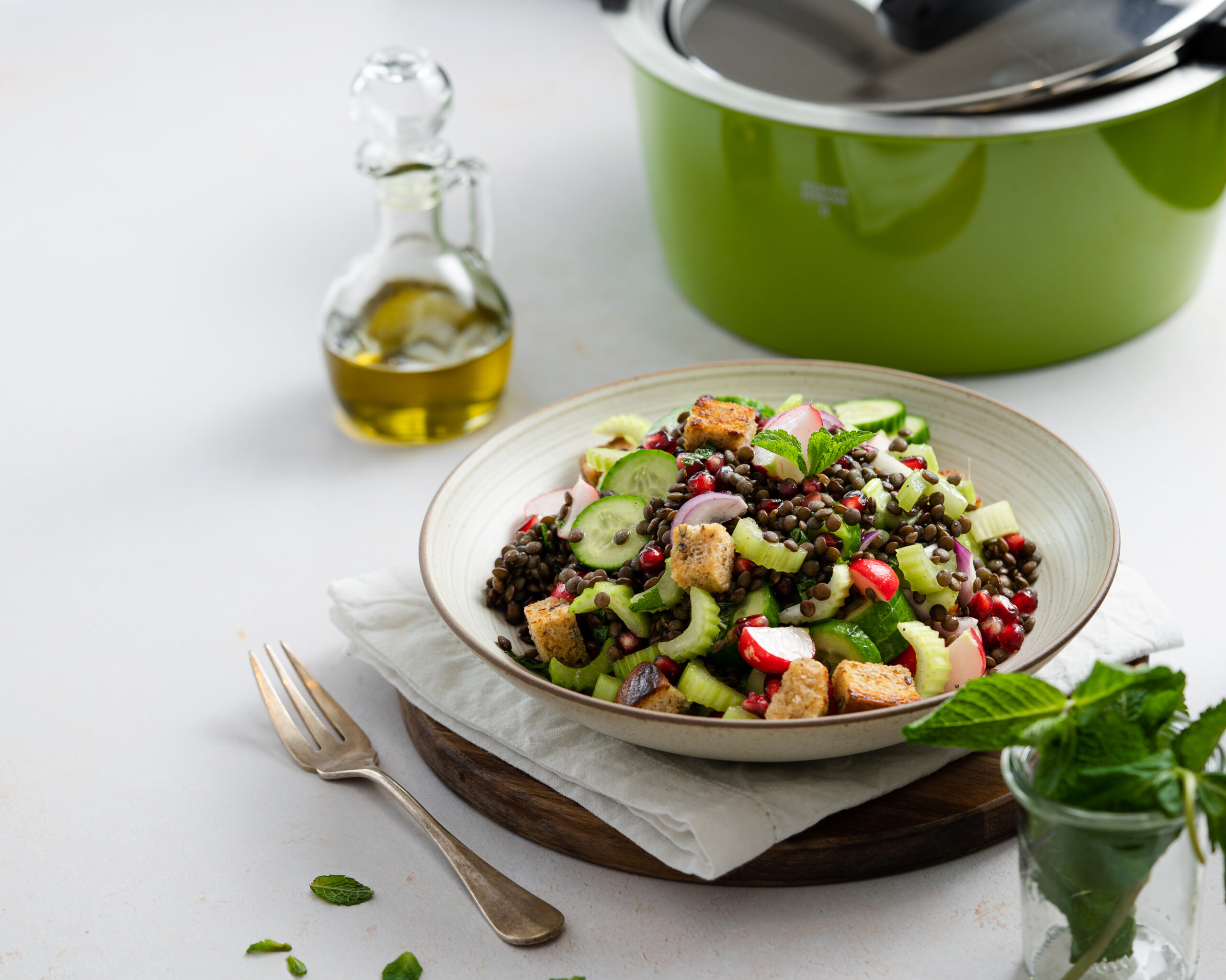 Der klassische Brotsalat – übrigens ein ideales Rezept zur Vermeidung von Food Waste – bekommt mit Zutaten wie Linsen und Granatapfel einen raffinierten Twist. Aromatische Tomaten, knackige Gurken, Radieschen und Sellerie sorgen für Leichtigkeit. Wie das Gemüse und Brot schnipp-schnapp gerüstet und geschnitten wird? – Mit dem Kuhn Rikon Allzweckmesser mit rutschsicherem Griff und superscharfer Klinge.