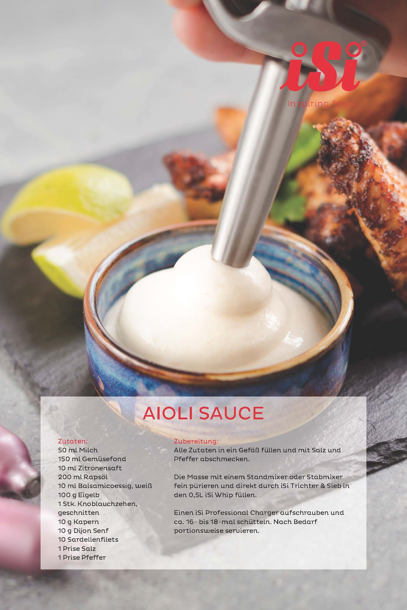 - Cremige Aioli: Die beliebte Knoblauchcreme wird im iSi Gourmet Whip besonders fein und luftig aufgeschlagen. Perfekt als Dip zu gegrilltem Gemüse oder als würzige Begleitung zu Fleisch und Fisch – für vollen Geschmack bei optimiertem Wareneinsatz.