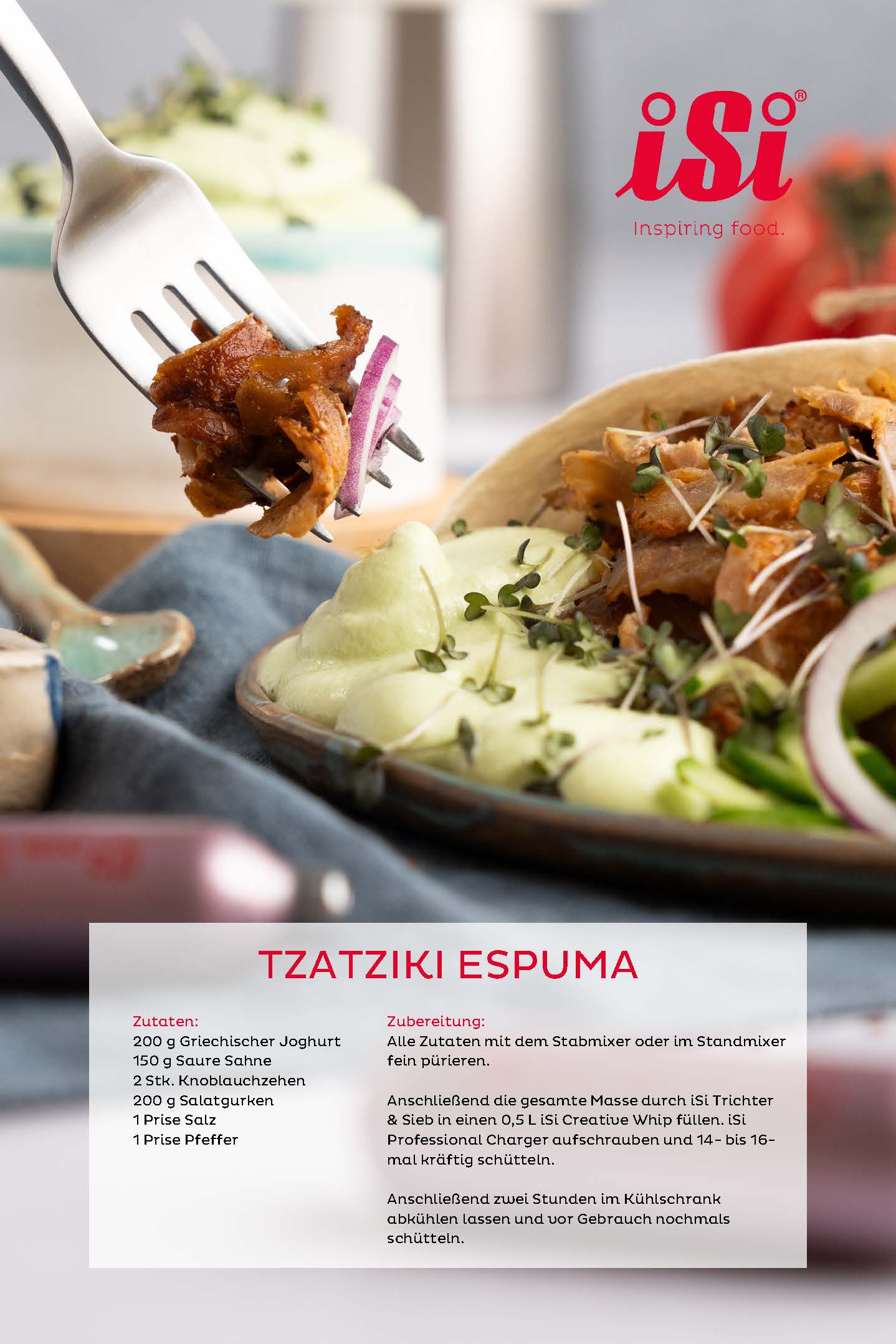 Tzatziki Espuma: Durch die Zubereitung im iSi Gourmet Whip interpretieren wir den Klassiker neu. Der luftige Tzatziki Espuma passt ideal zu Grillgemüse, Fleisch oder knusprigem Brot und sorgt für erfrischende Leichtigkeit.
