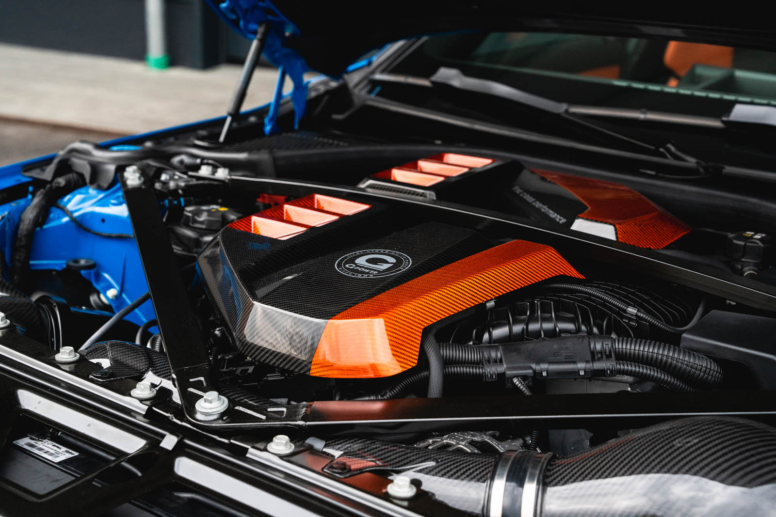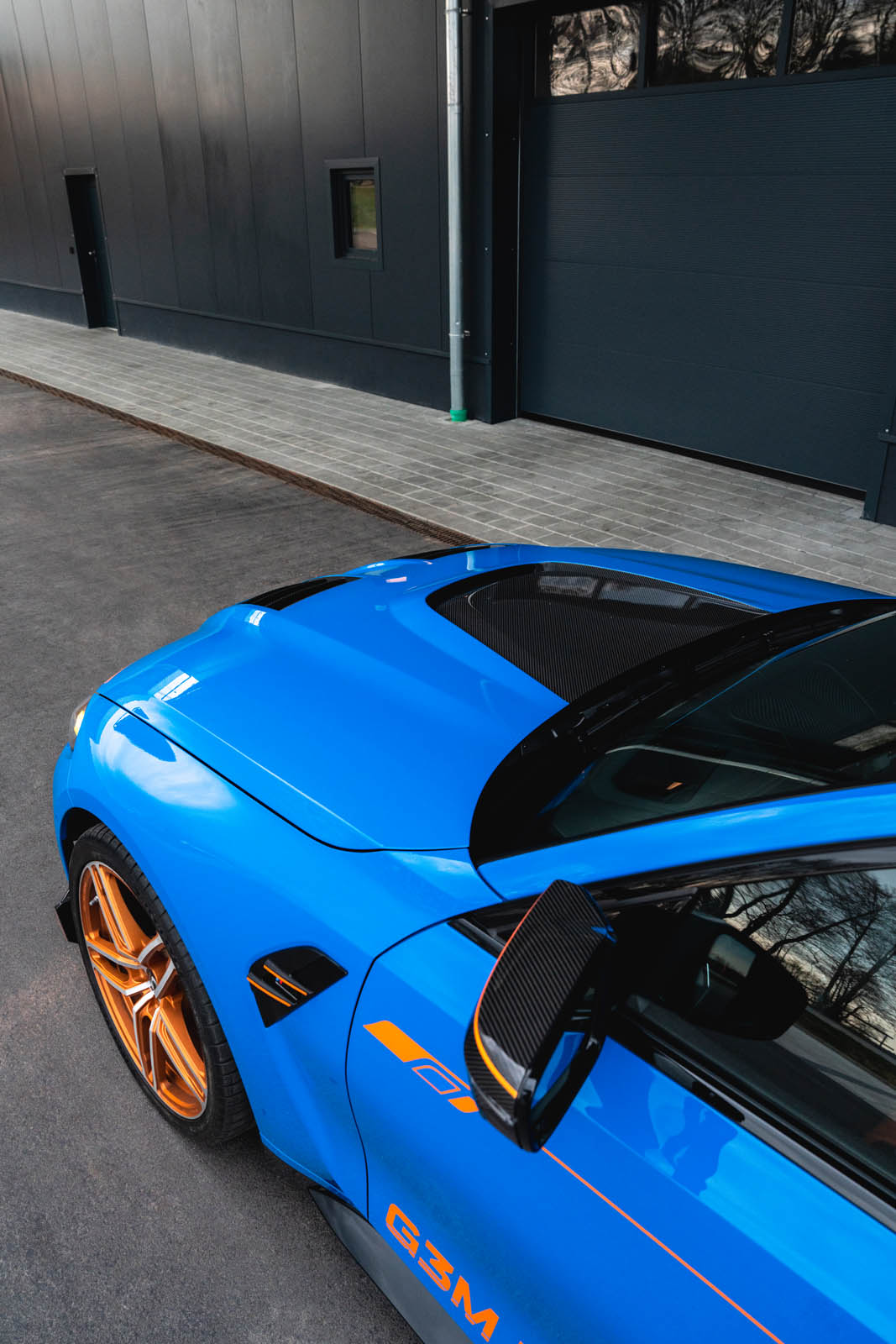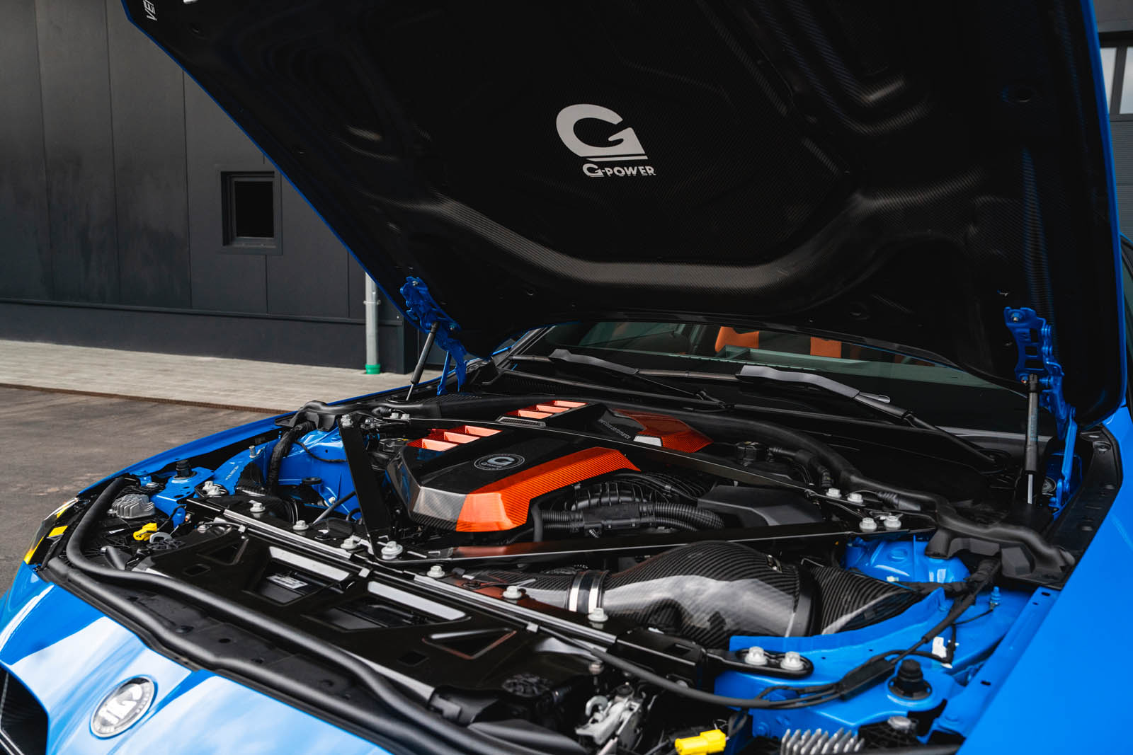 Ein weiteres Highlight ist die G-POWER VENTURI-Motorhaube aus Carbon. Sie optimiert nicht nur der Optik, sondern ferner das Thermomanagement im Motorraum. Zum Einsatz kam am vorgestellten G3M Bi-TURBO Touring die RS- Ausführung mit Teillackierung in Wagenfarbe. Ergänzend erhielt der Wagen weitere Carbon-Anbauteile in Form des GP-DYNAMIC RR-Frontspoilers, der GP-DYNAMIC RR-Frontnieren und der GP-SHURIKEN-Frontcorner. Unter der Fronthaube kam eine GP-Orange-Carbon-Motorabdeckung hinzu.