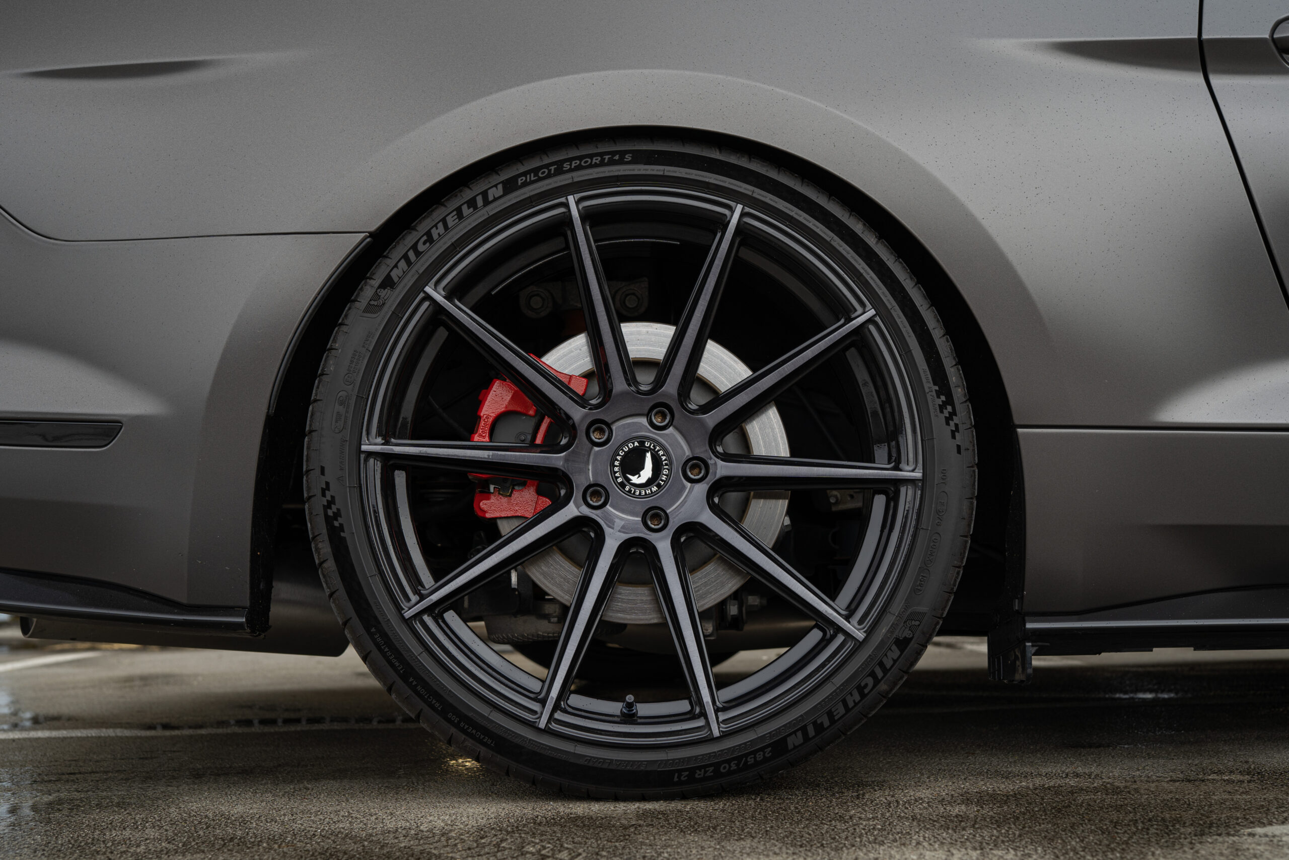 Die in Bergisch Gladbach beheimateten Spezialisten von cardiologie Tuning, JMS Fahrzeugteile-Partner und Stützpunkt zum Vertrieb der Barracuda-Felgen, stellten den Mustang auf Project 2.0-Felgen aus Barracudas Ultralight Series. Die dank der Produktion im Flow Forged-Verfahren besonders leichten Räder zeichnen sich durch ein Finish in Black Brushed und die Dimensionen 9×21 Zoll an der Vorder- und 10,5×21 Zoll an der Hinterachse aus. Die aufgezogene Bereifung misst 255/30R21 und 285/30R21. Das zugehörige Teilegutachten ermöglicht eine problemlose Eintragung in die Fahrzeugpapiere.