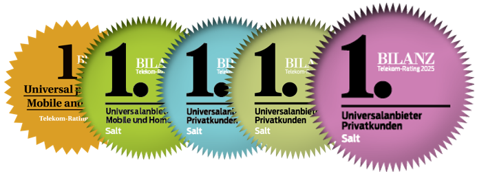 Unter allen Schweizer Anbietern wurde Salt zum besten Universalanbieter für Privatkundinnen und Privatkunden (Mobilfunk, Internet und TV) gekürt. Mit dieser Auszeichnung erhält Salt bereits zum fünften Mal in Folge den Spitzenplatz.