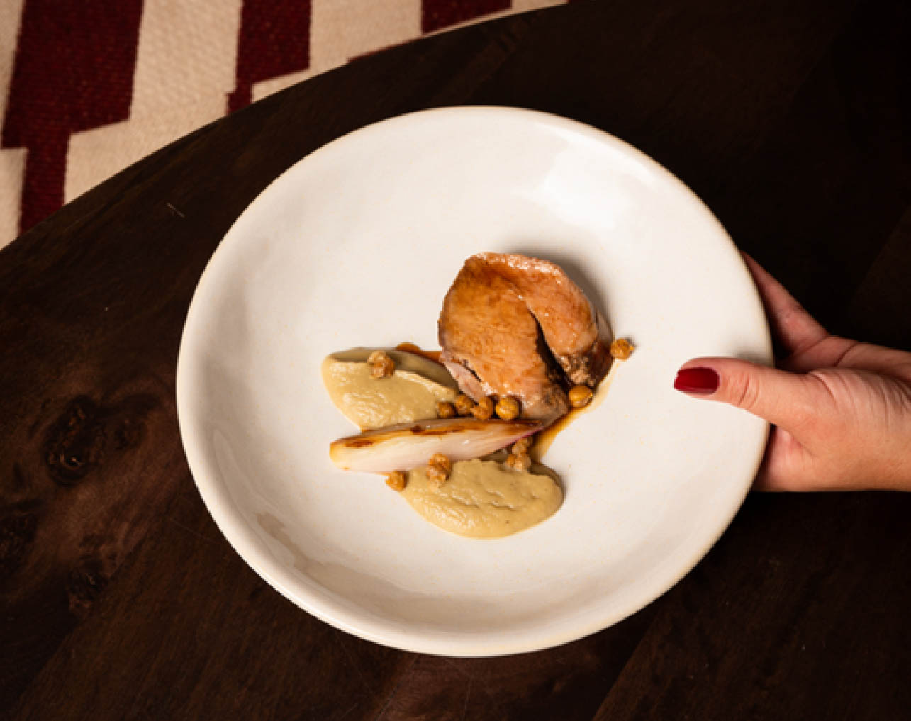Die Speisekarte ist bewusst kurz gehalten und wechselt alle vier bis sechs Wochen je nach Saison und Verfügbarkeit. Zu den Gerichten zählen unter anderem: Thunfisch-Tataki, geschmorte Fleischgerichte mit kräftigen Jus sowie Spargel-Erbsen-Risotto.