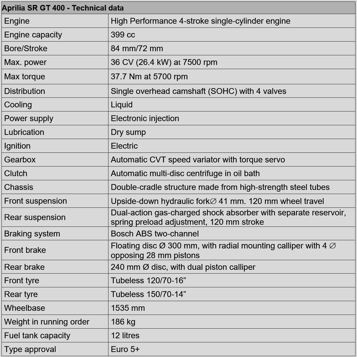 Wie bei Aprilia üblich, steht der technische Aufbau im Mittelpunkt. Der Doppelschleifenrahmen aus hochfestem Stahl ist extrem verwindungssteif und sorgt für präzises Feedback, Stabilität und ein sicheres Fahrgefühl. Gleichzeitig wurde das Gewicht konsequent reduziert: Rahmen, Motor und Felgen tragen dazu bei, dass der SR GT 400 nur 186 kg wiegt – ein Spitzenwert in seiner Kategorie.