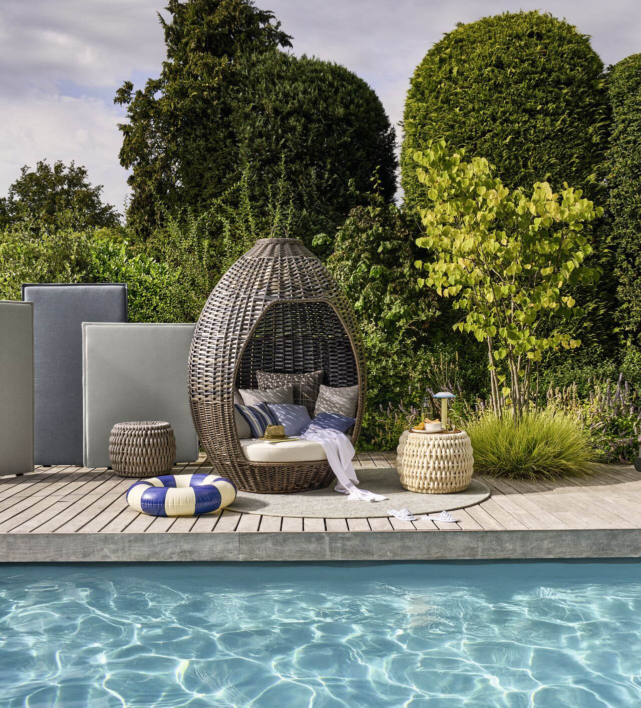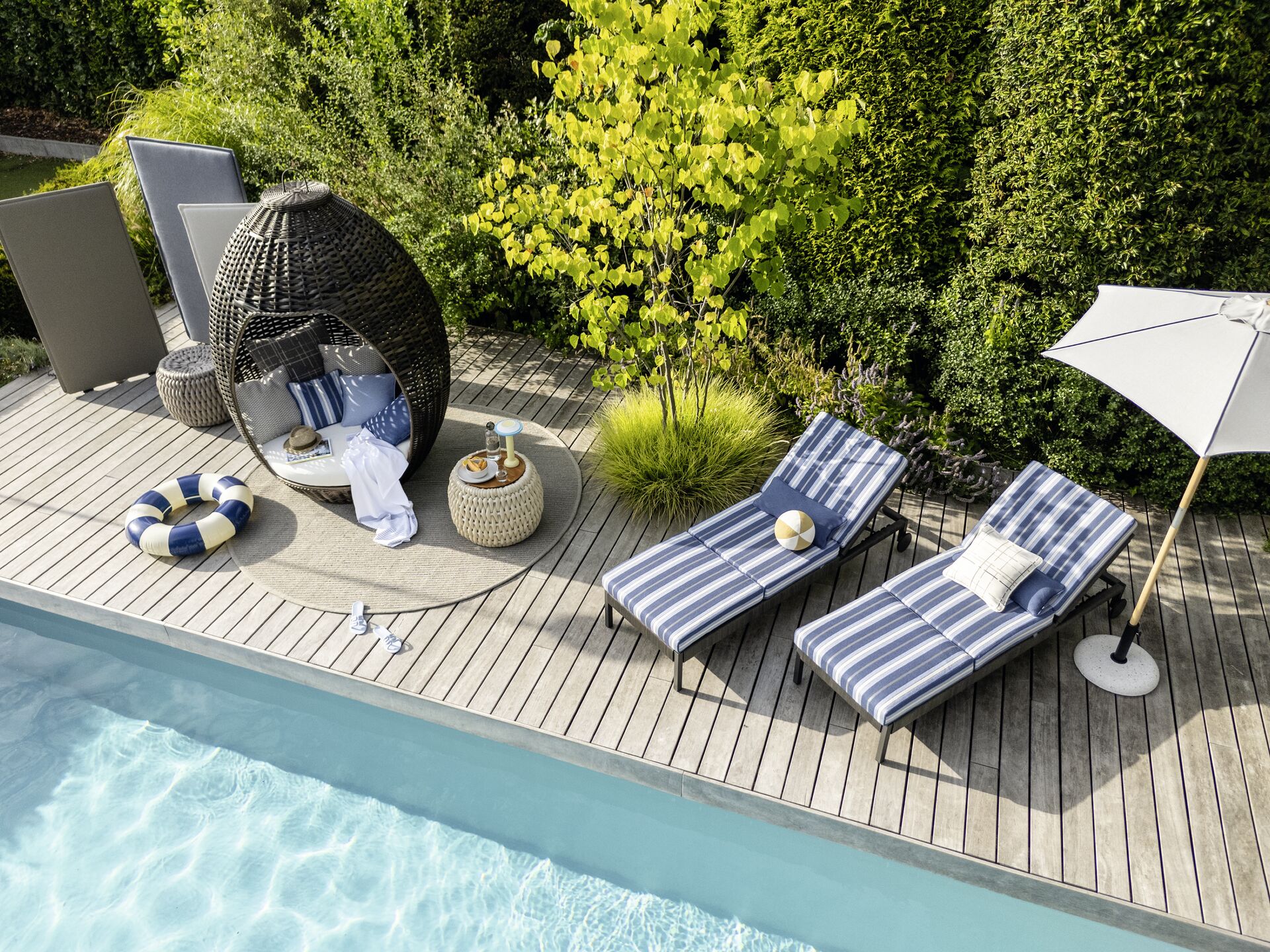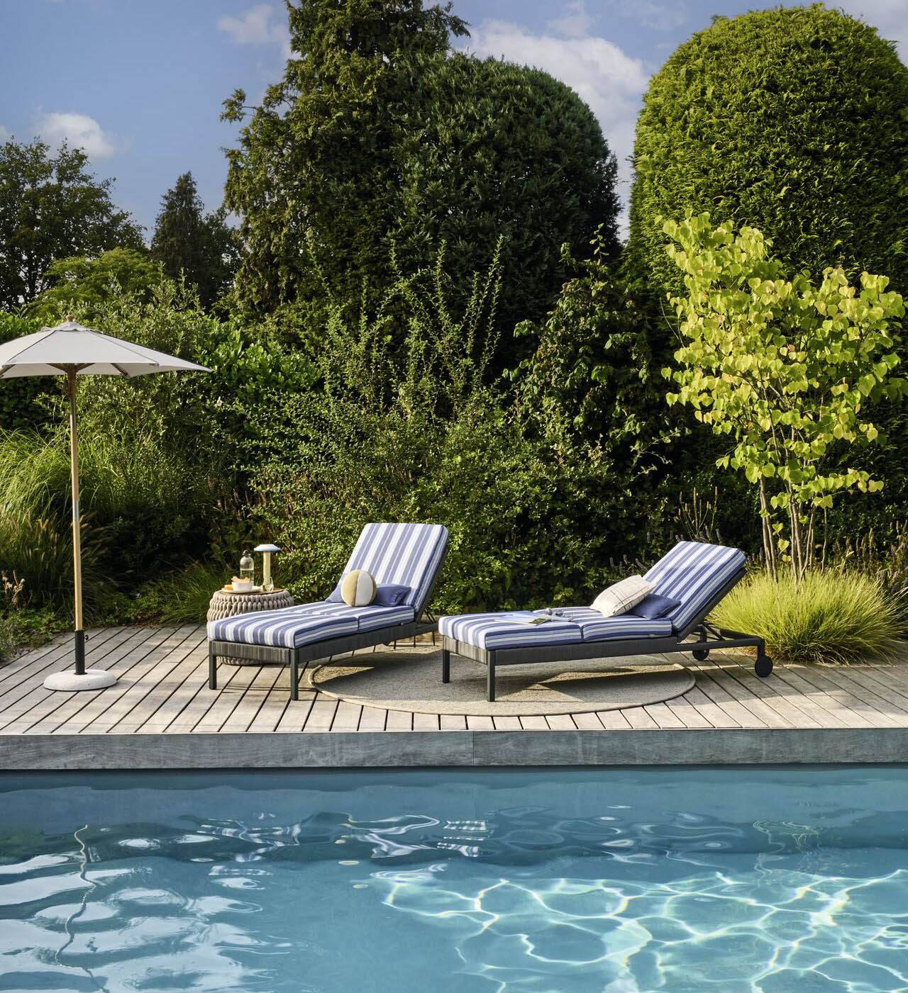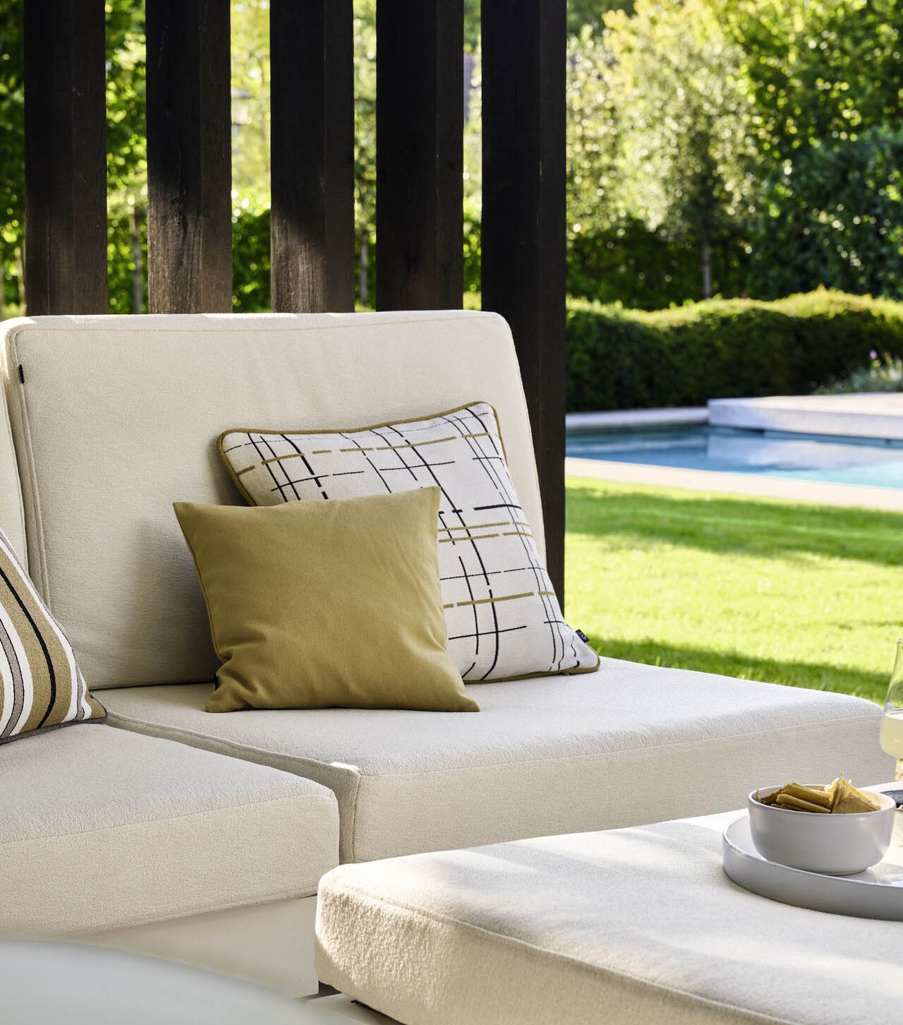 Ebenso prägend für die hochwertige Kollektion ist die Verwendung anschmiegsamer Bouclégarne. So entstehen textile Gestaltungen, die nicht nur lässig und stilvoll, sondern auch sehr wohnlich wirken – ob auf Terrassen oder Balkonen, in Pool- oder Wellness-Bereichen. Zugleich erfüllen die Bezugsstoffe aus Polypropylen mühelos die bei der Gestaltung von Wohn- und Freizeitbereichen typischen Anforderungen, wie hohe Lichtechtheit, schnelles Abtrocknen, Waschbarkeit und Chlorbeständigkeit.